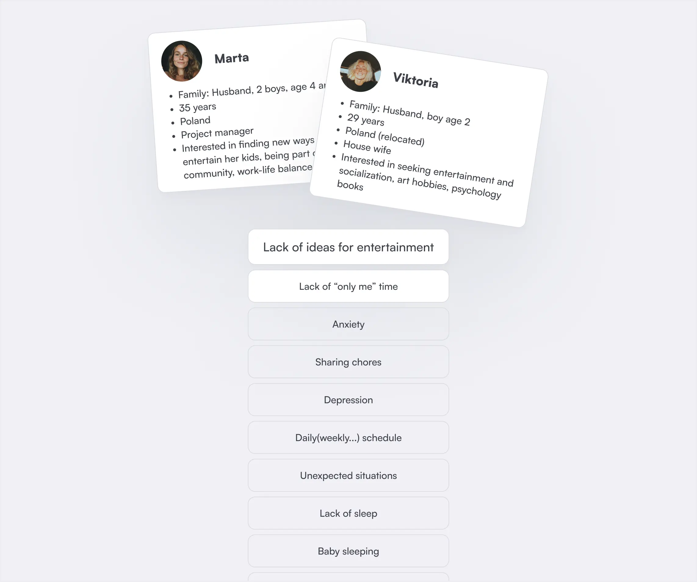By mapping out their needs and pain points, I prioritized those that had the greatest emotional impact and frequency—such as finding entertaining activities for kids and building meaningful community ties. These focus areas aligned closely with Kiddify’s mission to reduce parental loneliness and make everyday life easier.