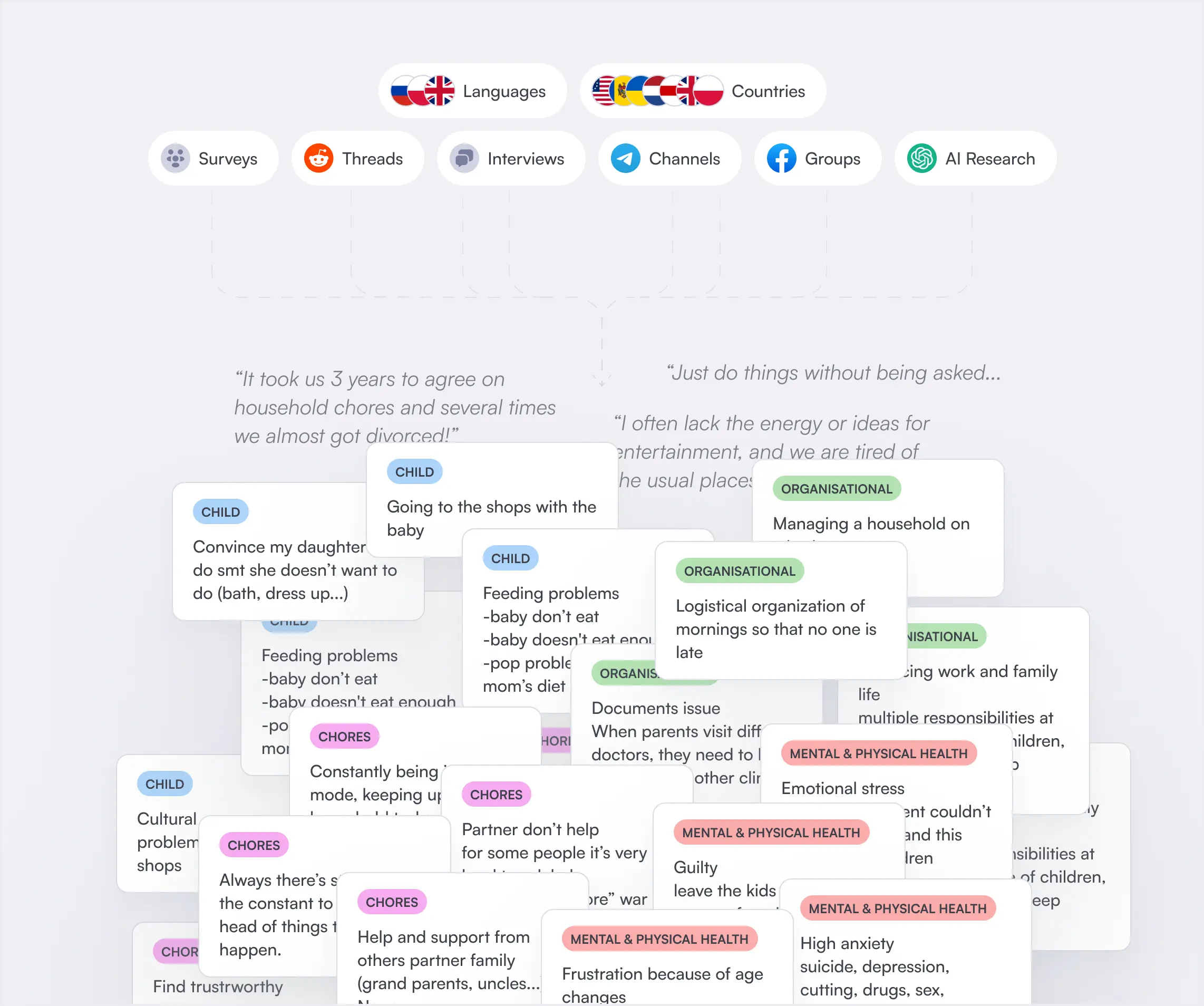 To truly validate the need for Kiddify, I immersed myself in the world of modern parenting and took a hands-on approach to research. I began by conducting in-depth interviews with 9 parents from different backgrounds, making sure to include both locals and emigrant families for a richer perspective. Wanting to hear from as many voices as possible, I organized a survey in three languages—English, Polish, and Russian—so that language wouldn’t be a barrier to honest feedback. My research didn’t stop there; I scanned parenting forums and lively social media groups, soaking up real stories and day-to-day struggles shared by parents in public and private spaces.